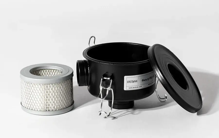 Позволяет защитить рабочее пространство воздуходувки/насоса от попадания твердых, взвешенных в нагнетаемом воздухе частиц, степень фильтрации 10 мкм.